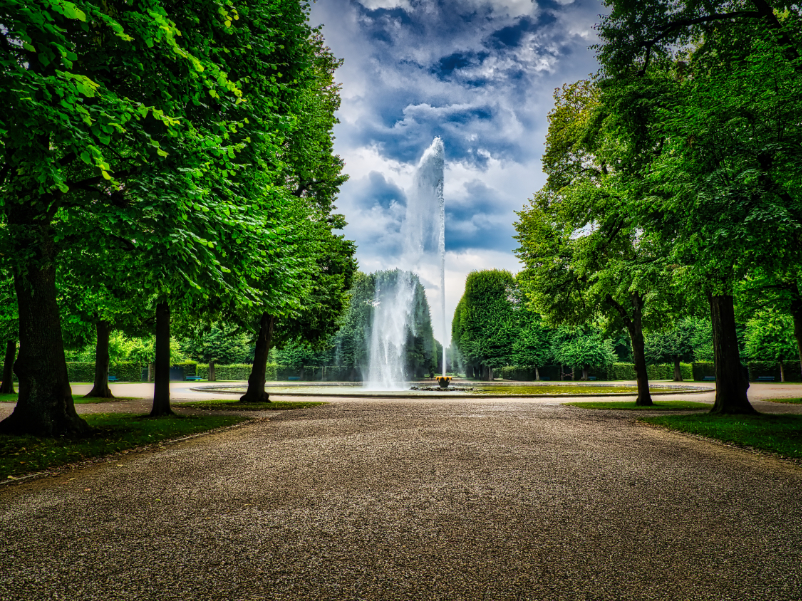In der Mitte der Anlage erhebt sich der große Springbrunnen – ein steinerner Mittelpunkt, ein Auge im Gesicht der Anlage. Vor dunklem, dramatisch aufgewölbtem Himmel schießt die Fontäne hoch, wie ein ewiger Triumphruf aus Wasser. Das Rauschen des Strahls scheint den Takt zu geben für die strenge Geometrie ringsum, als müsse sich jedes Beet, jeder Kiesweg, jeder Buchsbaum diesem stummen Befehl fügen.